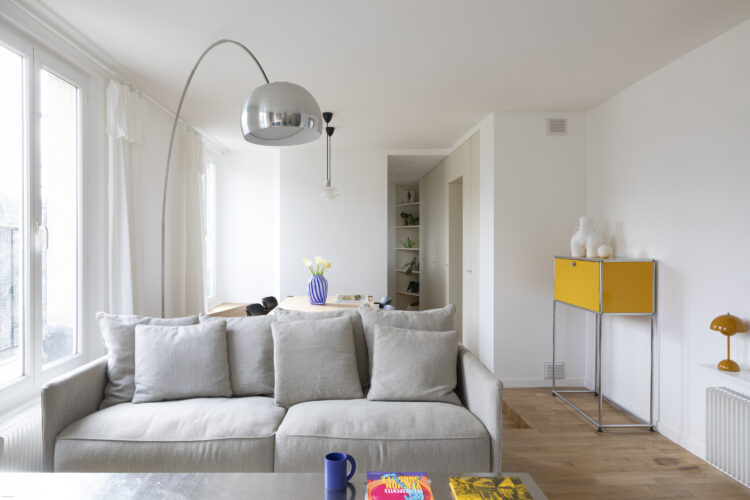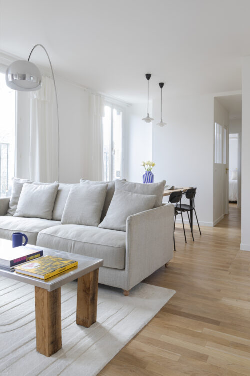 Coup de chance : l’appartement qu’elle visite avec son conjoint Antoine en 2022 a la qualité première de ne pas avoir été rénové depuis des lustres, en plus d’être baigné de lumière… “Pré-requis absolu, quitte à être éblouis”, explique le couple, lequel a trop longtemps vécu dans un bien donnant sur une cour sombre. Leur futur foyer dispose, en outre, d’un impressionnant linéaire de balcon qui donne sur un boulevard bien connu du 11ème arrondissement parisien, axe privilégié des cortèges de manifestations dans la Capitale. Réunion bizarrement agencée de deux appartements, son immense pièce de vie leur fait également de l’œil, aussi mal fichue soit-elle à l’époque. “Nous avons été immédiatement séduits : d’abord par le potentiel de ce bien, ensuite par la profusion des commerces alentours… Bars, restaurants, boutiques, marché en plein air : tout est à portée de main dans ce quartier où nous n’envisagions pas de vivre jusqu’alors. ”