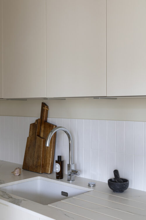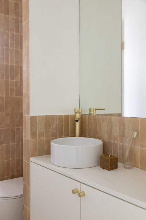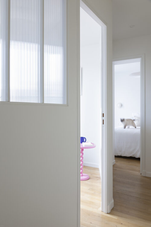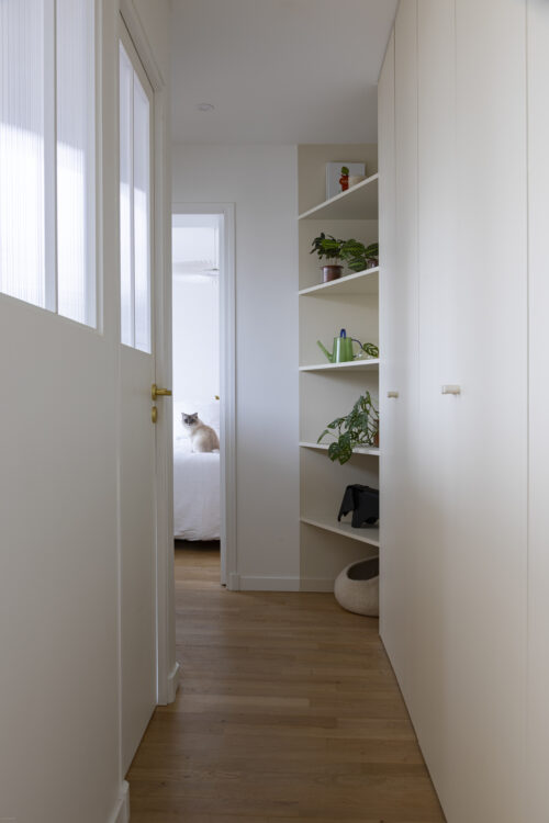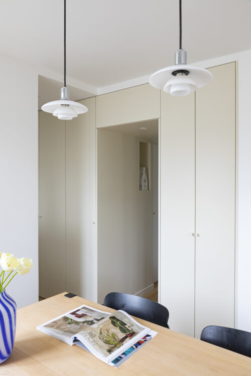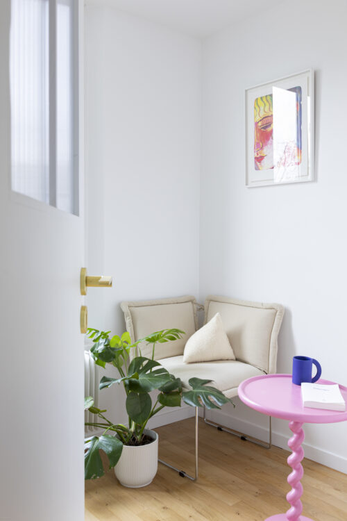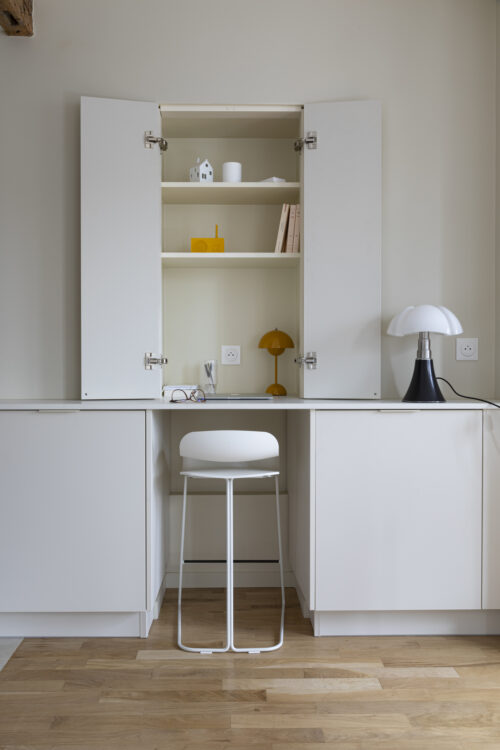 Marie et Antoine décident alors de faire appel au service Sloft Projets et rencontrent l’architecte partenaire Alice Hervé de Ferron, à la tête de māsa studio. Leur programme : faire de ces 60 m² à la vue imprenable “un endroit reposant, en retrait de la vie parisienne.” Un lieu évolutif qui cumule les fonctions, également, où le couple pourra télétravailler ensemble sans se gêner. “Il nous fallait deux espaces séparés pour passer nos appels en toute discrétion”. Un bureau compact est donc implanté dans le séjour d’origine, sans pour autant empiéter inutilement sur la pièce de vie – Marie et Antoine adorant recevoir.