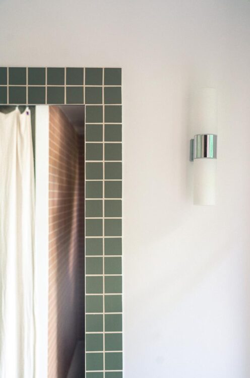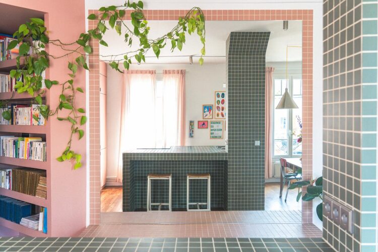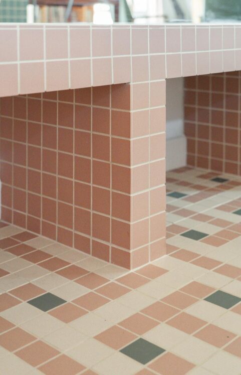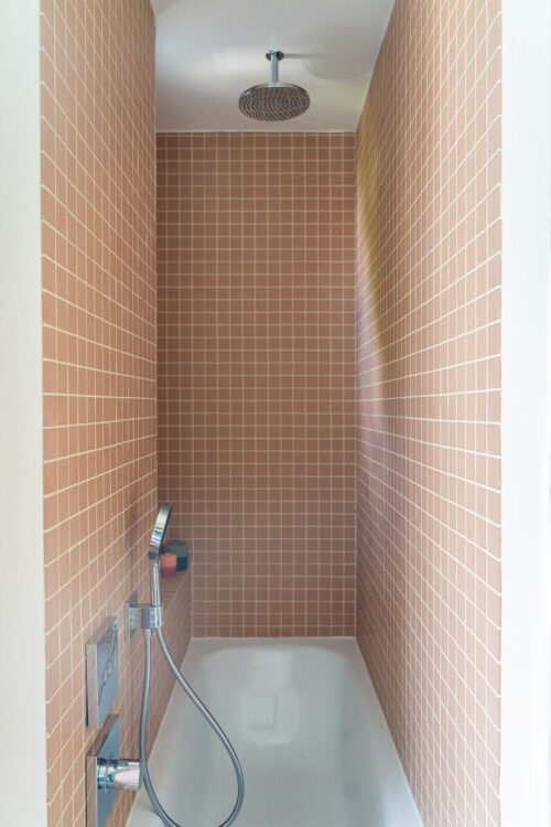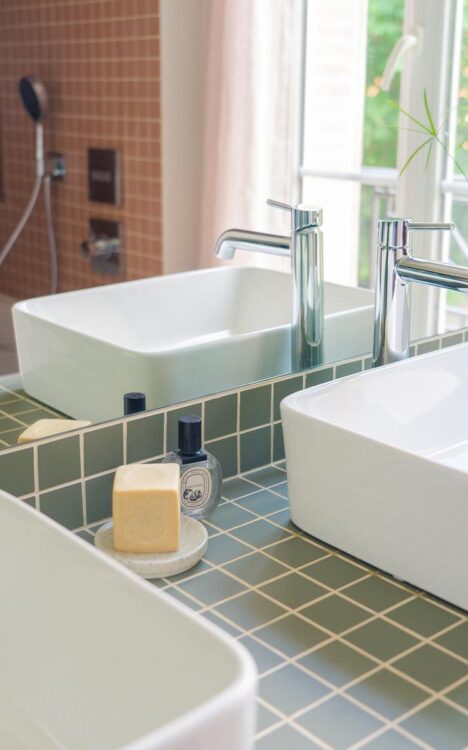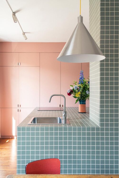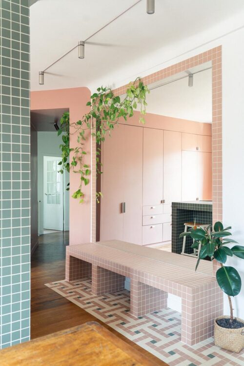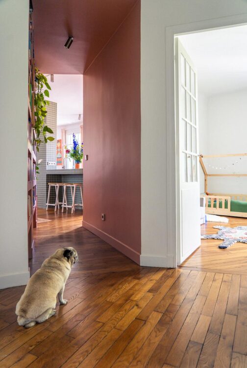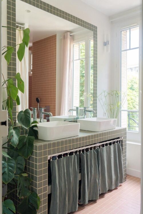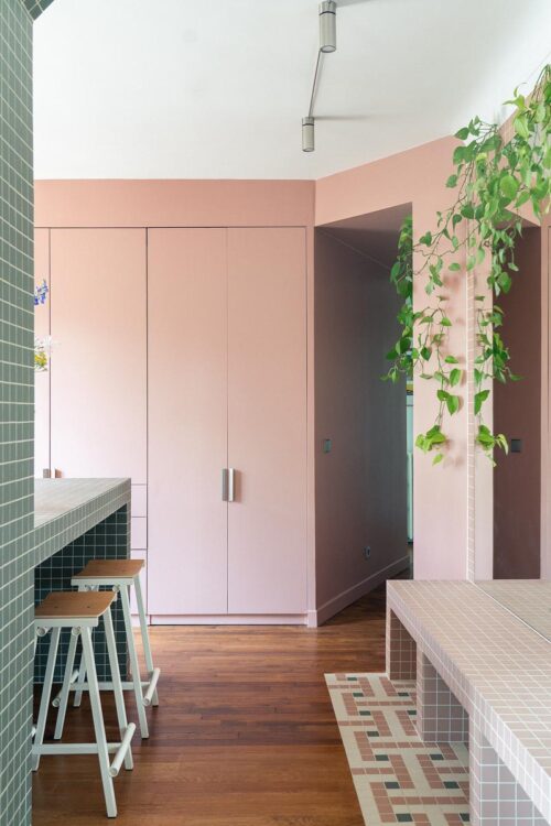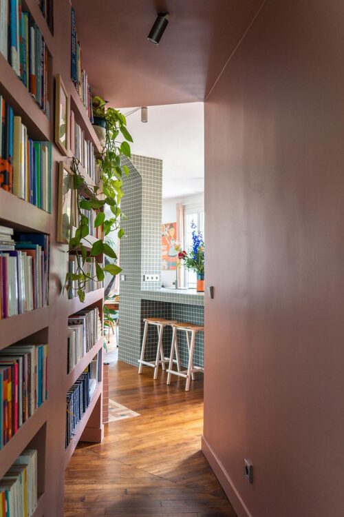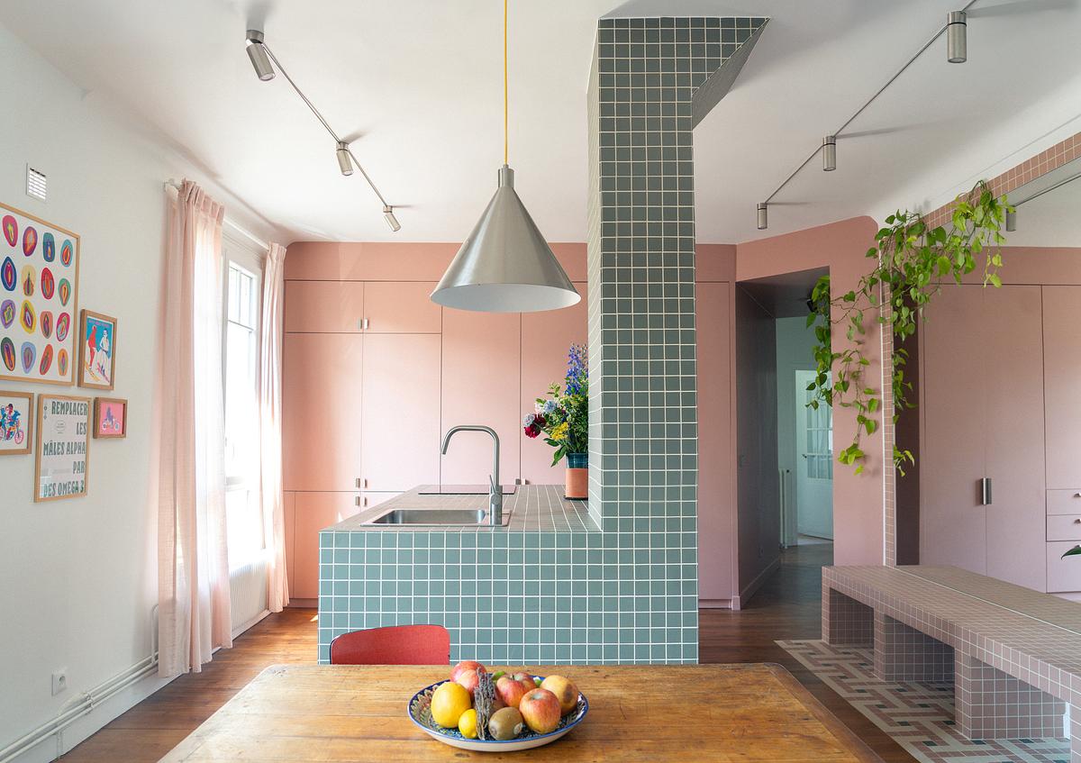 « Le dinosaure » sur le chantier, elle est devenue la signature de la cuisine. L’îlot apparaît comme le point de rencontre, la bibliothèque-couloir le lien entre les deux anciens appartements et le carreau de 5 × 5 centimètres en grès cérame Winckelmans le fil conducteur de cette réunification. Autour de lui, la palette — vieux rose, vert australien ou sauge et blanc — rythme les espaces, affirme une identité douce mais marquée.