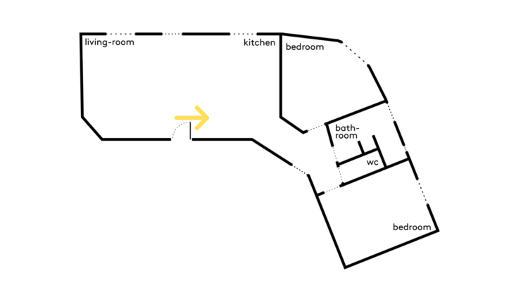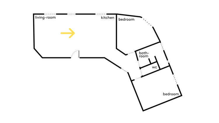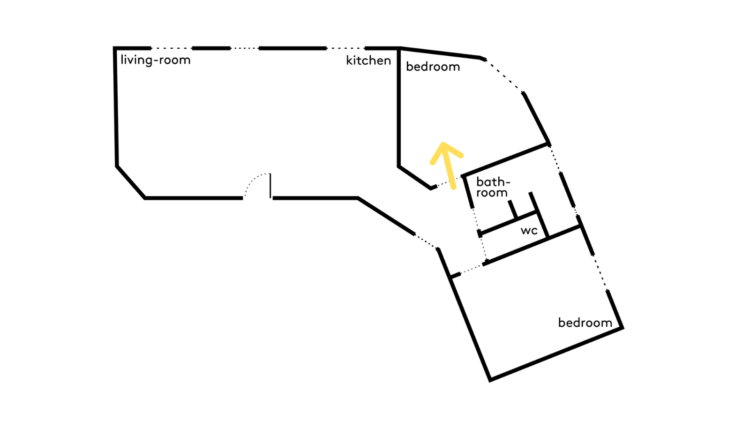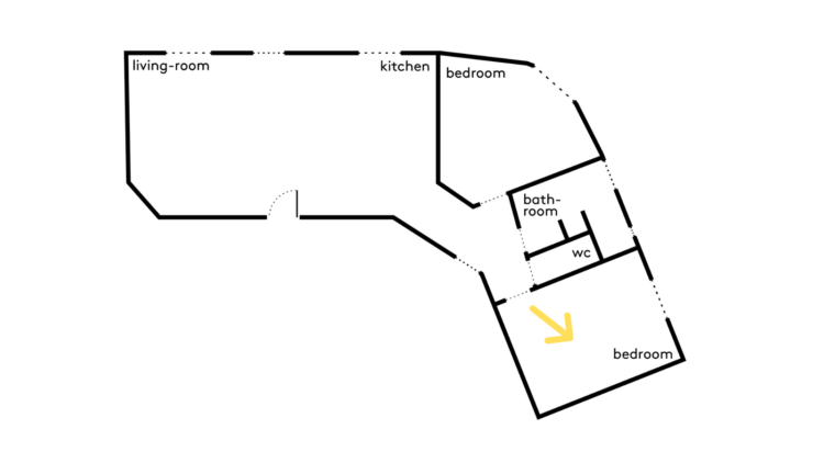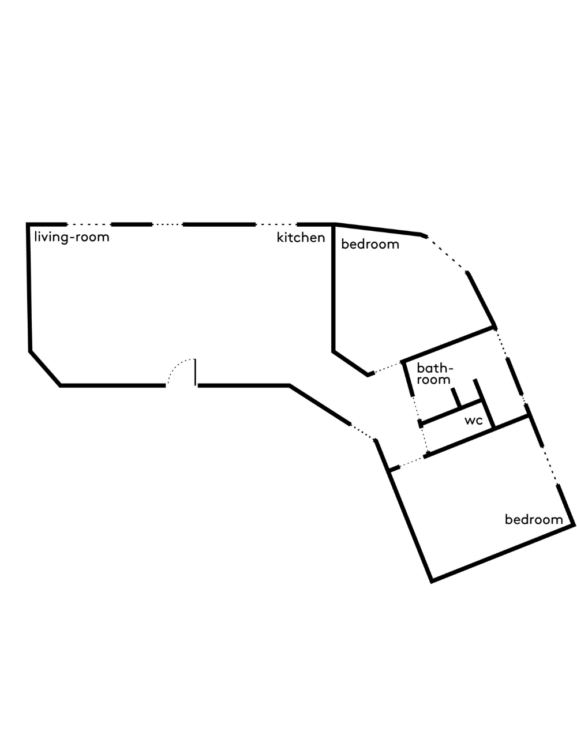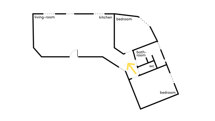 Le premier plan propose trois chambres, un T4 compact, mais le coût dépasse l’enveloppe budgétaire. Le projet se recentre sur un T3 plus fluide, avec un espace de vie plus généreux. Côté cuisine, une contrainte technique devient l’élément structurant de la pièce de vie : impossible à déplacer ou à dissimuler, cette colonne d’eau de l’immeuble est carrelée et mise en scène. Surnommée