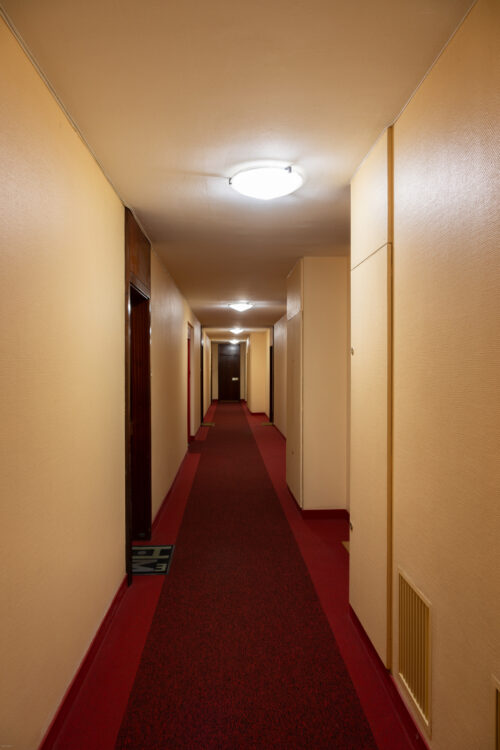 Moquette rouge, portes en plaqué chêne et plafonniers typiques… L’immeuble distille son ADN seventies jusque dans ses parties communes.
