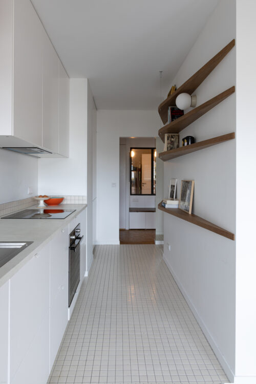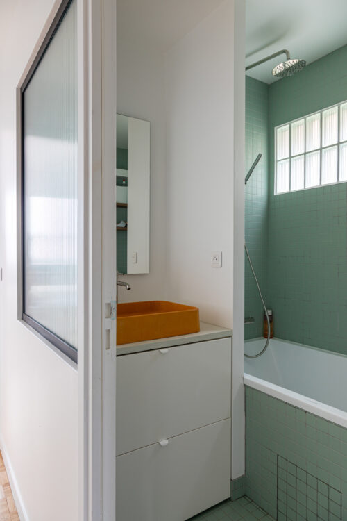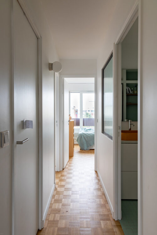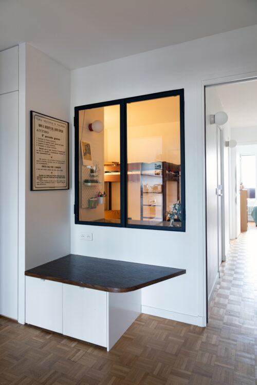 Le couloir de circulation, à l’origine aveugle, gagne en luminosité grâce à l’ajout d’une verrière translucide qui donne sur la fenêtre de la salle de bain.