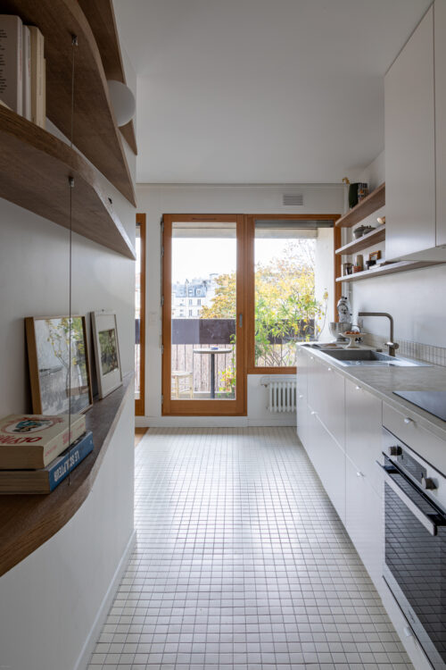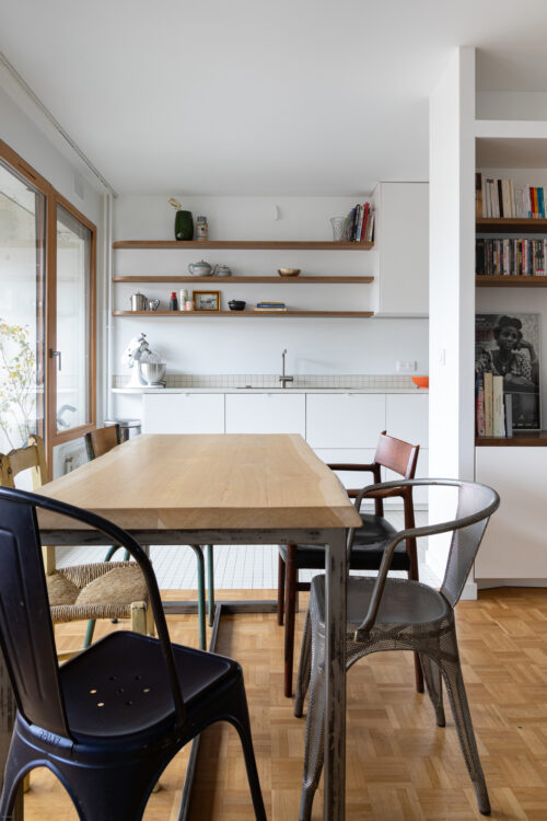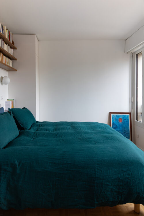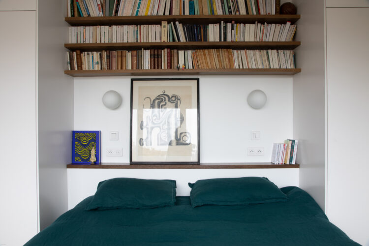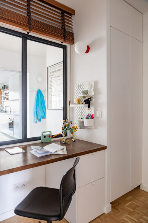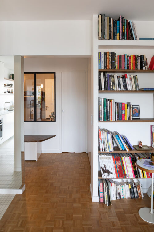 La cuisine jusqu’alors fermée sera partiellement ouverte et dissociée du séjour par une cloison qui fera office de bibliothèque XXL. L’ancien salon cédera quant à lui sa place à l’espace nuit dédié à Emmanuelle et Lucas. De l’autre côté de l’appartement, les surfaces des deux chambres existantes seront revues : autant de place faite pour en créer une nouvelle en « second jour », dotée d’une verrière d’atelier qui ouvrira d’abord sur l’entrée de l’appartement, puis dans son prolongement sur la baie vitrée. Esthétiquement, l’architecte garde en tête les codes de l’époque de construction de l’immeuble, qu’il modernise.