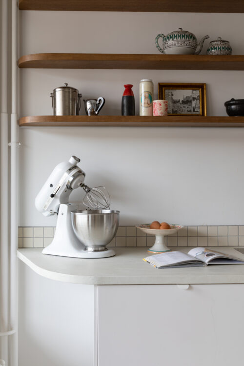 Dans cet espace qui mixe affectif, pratique et ancien, la teinte lumineuse du carrelage 5×5 (Cesi) répond à celle du plan de travail en béton (Marius Aurenti). Le tout posé sur une cuisine Ikea.