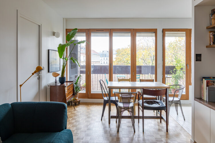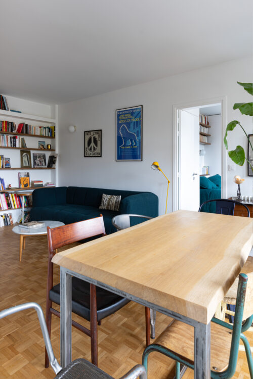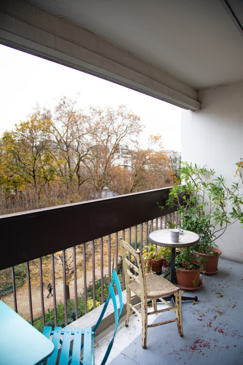 « Nous vivions dans le quartier depuis longtemps et nous avions repéré cet immeuble, explique Emmanuelle qui y habite désormais avec son conjoint, Lucas, tous deux journalistes, et leurs trois garçons. Il fait face à un très beau square du XIXème siècle qu’entourent de nombreux bâtiments anciens… L’ensemble a un charme fou. » La construction sur laquelle ils ont jeté leur dévolu dénote pourtant dans le paysage : édifiée dans les années 70, elle surplombe l’ensemble de ses 15 étages brutalistes. Quand un logement s’y libère, le couple s’en porte immédiatement acquéreur : « il avait exactement la surface qu’on recherchait, même s’il lui manquait deux chambres. » Son balcon qui donne directement sur l’espace vert, son orientation double et son imposante baie vitrée sont d’autres atouts de taille pour la famille recomposée.