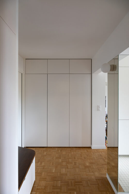 Dès l’entrée, la luminosité et les volumes de l’appartement séduisent l’œil. Au fond, un grand linéaire de placards qui permet de ranger les manteaux fait aussi office de buanderie : dans un souci d’optimisation d’espace, lave-linge et sèche-linge y sont intégrés.