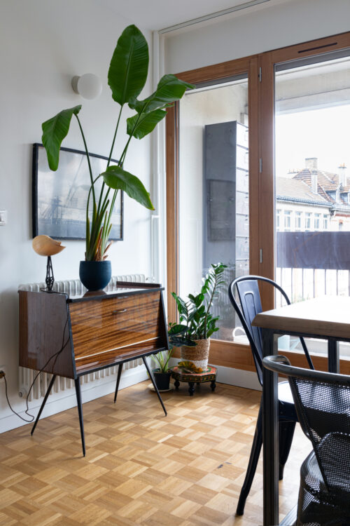 Retour dans le séjour, où un meuble mid century fait office de bar.
