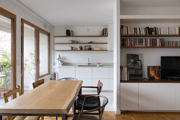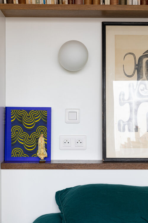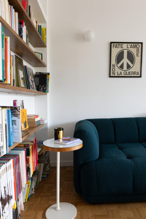 Côté séjour, bibliothèque et meuble télé offrent un supplément non négligeable de linéaire à une pièce dont la principale paroi est vitrée. « Mon conjoint et moi-même sommes tous deux journalistes, les enfants lisent aussi beaucoup. Je n’ai jamais assez de place pour stocker les bouquins… »