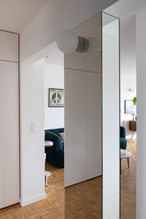 Pratique avant de sortir, le miroir qui épouse les faces du mur porteur de l’entrée permet aussi de le camoufler… La pièce s’en voit encore agrandie.