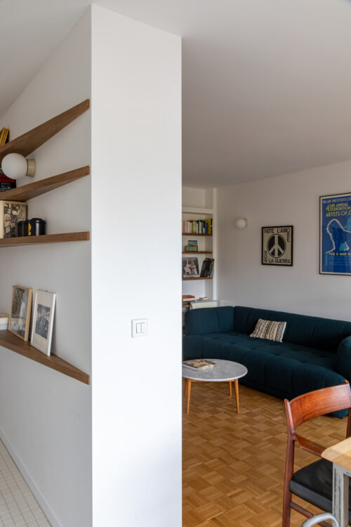 Pensée pour séparer visuellement la pièce à vivre, la cloison et ses étagères abritent côté cuisine tablettes et bibelots. Appliques : La Quincaillerie Moderne.