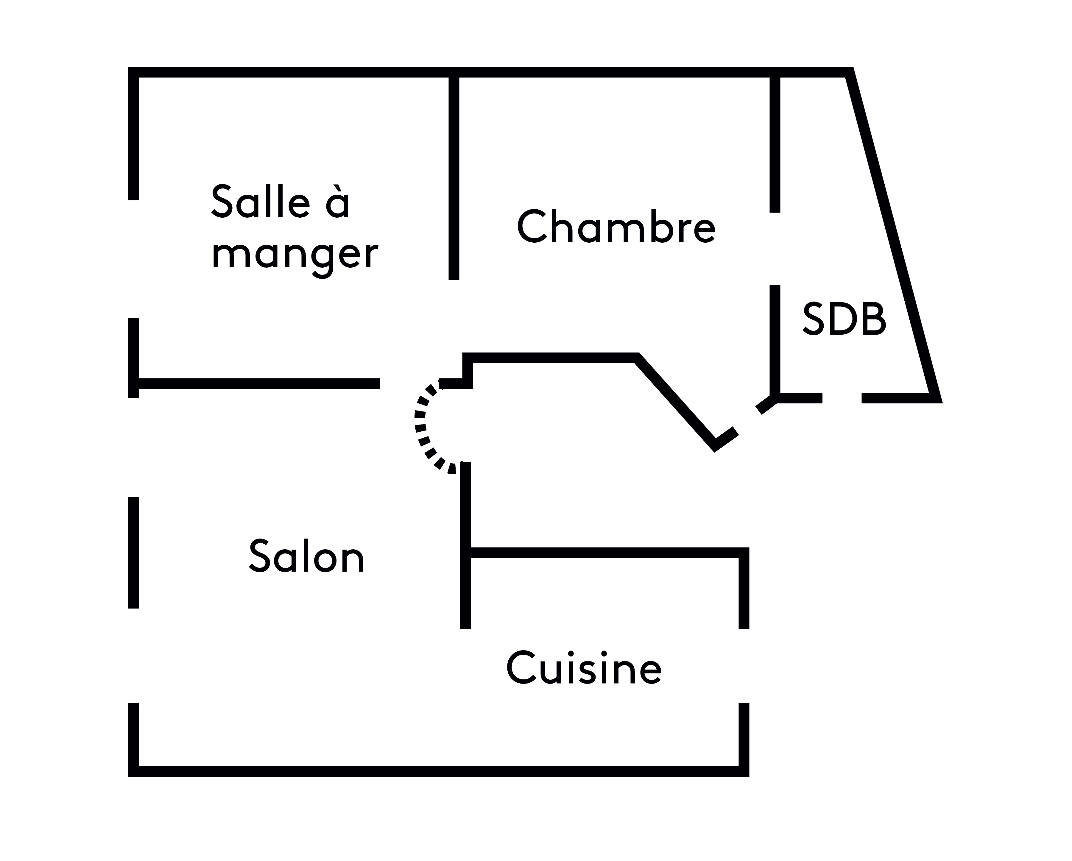 La distribution est restée proche de la base existante. C'est un trois pièces en forme de "U" s'articulant autour de la cage d'escalier. La cuisine donne dans le salon. Celui-ci communique avec la salle à manger qui se poursuit par la chambre qui donne accès à la salle de bain.