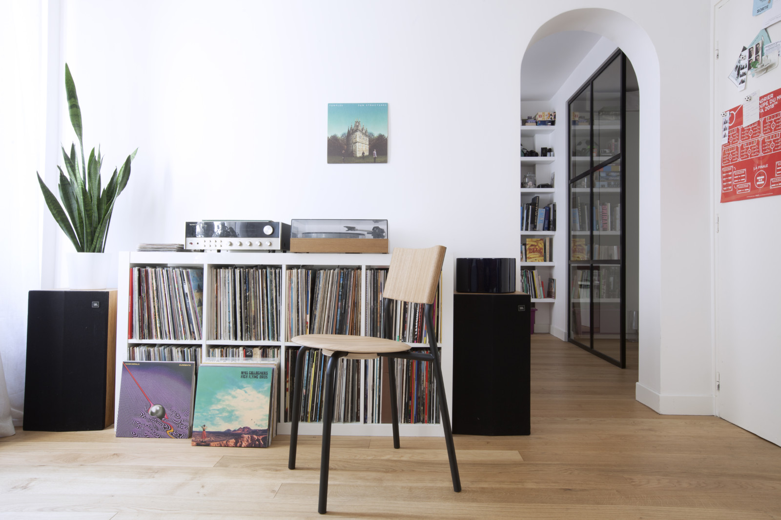 Le résultat est un écrin lumineux, idéal pour accueillir les différentes collections de ses habitants. Ils aiment la musique, l'art, le design, les plantes et le foot. On retrouve donc dans cet appartement une commode remplie de vinyls, de très jolies lithographies, une belle série de meubles design, des pots de fleurs disséminés un peu partout et quelques fanions d'équipes de Ligue 1 !