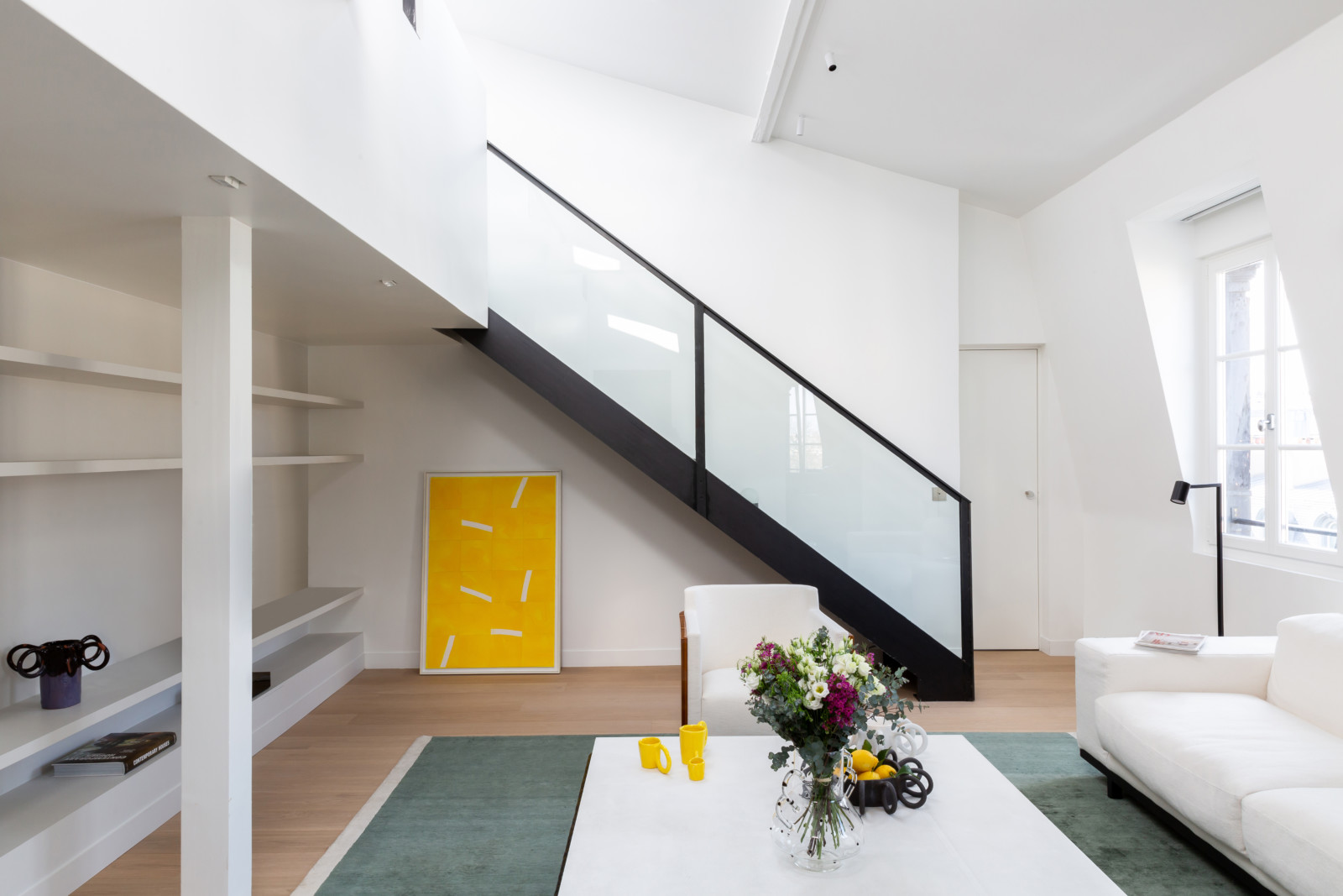Pour ce projet, pas de gros travaux de restructuration en vue. “Il n’y avait rien à casser”, commente Inès Deschodt. "On s’est plutôt concentré sur l'aménagement en créant de nombreux éléments sur mesure." L'architecte a aussi mené une réflexion globale sur l’éclairage. “Les clients voulaient mettre en valeur la structure existante de l’appartement, en faisant notamment ressortir les poutres et la hauteur sous plafond grâce à la lumière naturelle mais aussi avec un jeu d’éclairage”, ajoute-t-elle. Le mot d’ordre était de remettre le duplex au goût du jour, le sublimer, tout en sobriété. Le blanc domine, ravivé par quelques touches de couleur apportées par les pièces de design et les œuvres d’art contemporain choisies avec soin qui habillent l'appartement. Les clients étant sensibles aux beaux objets, un important travail de sourcing a donc été mené. Pour un résultat cohérent et parfaitement fini. Comme un cocon avec ses trésors bien gardés.