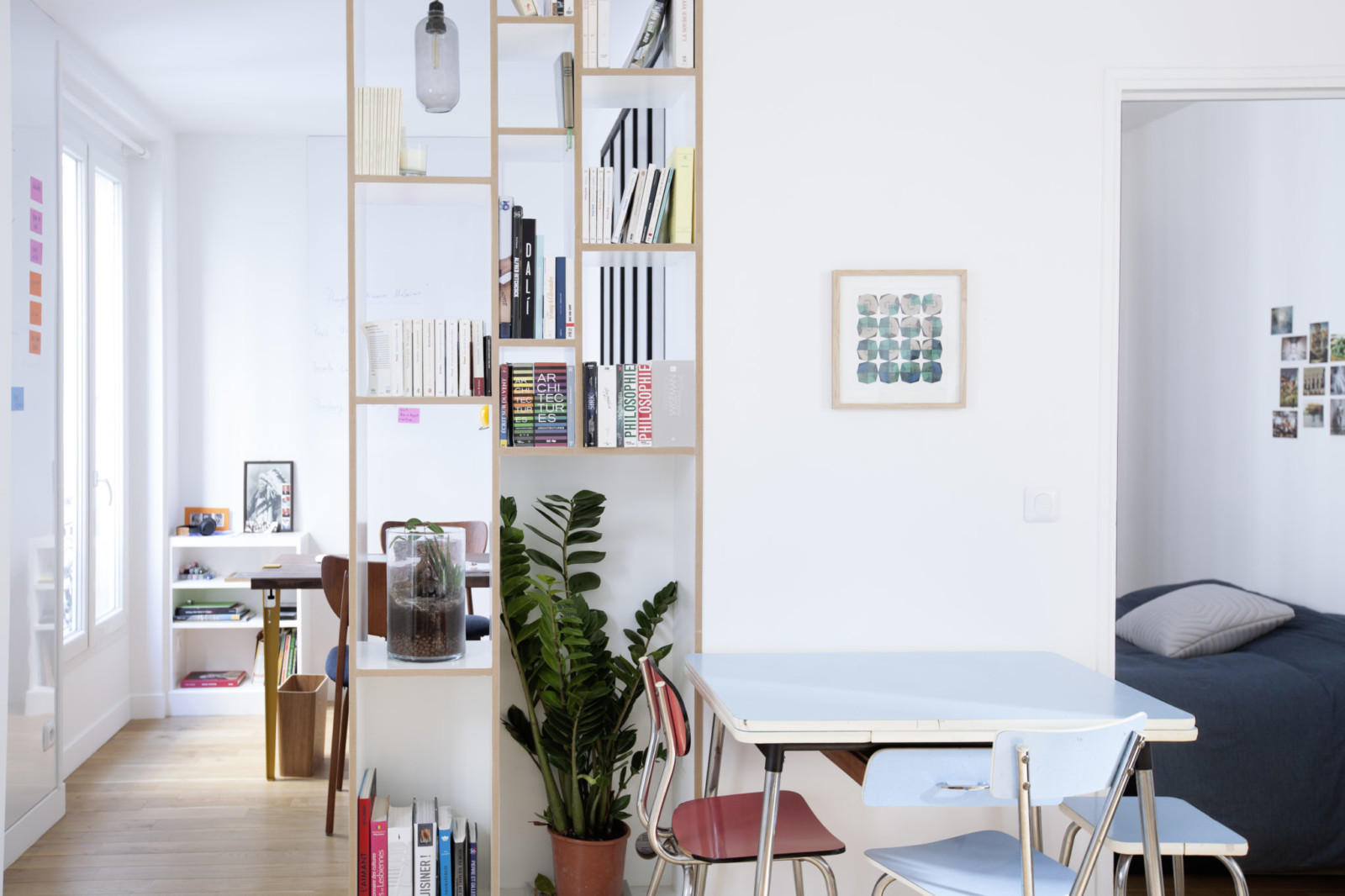 Cette semaine, plan-séquence sur le studio de Victor, un jeune réalisateur. À l’origine, ce 40 m² était constitué de deux chambres. Après repérage et étude des lieux, l’architecte Félix Haudrechy a abattu la cloison de séparation mais usé d’effets très spéciaux pour conserver des espaces bien distincts où travail et détente sont inscrits au même générique.
