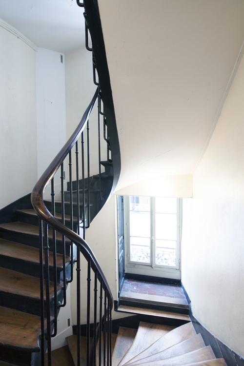 Un escalier parisien. On grimpe les marches. Moteur ! La visite peut commencer.
