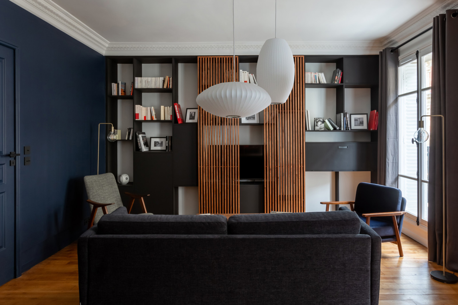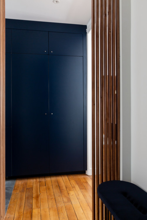 Plongée immédiate dans une ambiance élégante et graphique dès l’entrée… On y retrouve directement les codes de l’appartement avec ce mix de bois, de bleu, teinte Hague Blue de Farrow & Ball, et de blanc, véritables fils conducteurs de la visite. Un choix de matériaux et couleurs dans l’air du temps, très apprécié de l’univers hôtelier.