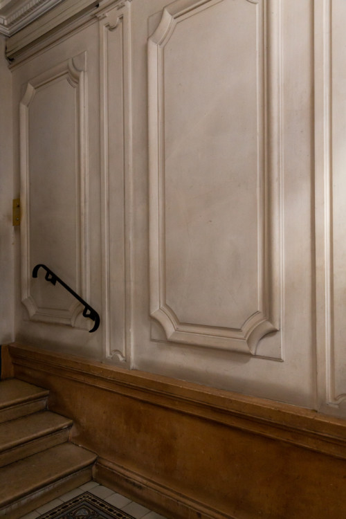 Dès l’entrée, les codes haussmanniens sont visibles avec la cimaise à corniche et les panneaux moulurés.