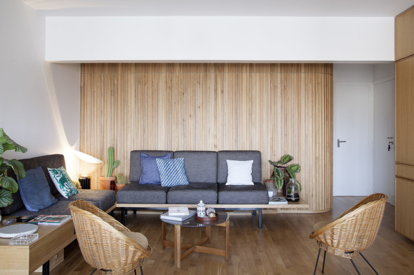 Chez Paolo, on rentre tout de suite dans le vif du sujet ! Accès direct dans le séjour le long d’une cloison en bois qui camoufle élégamment la buanderie.