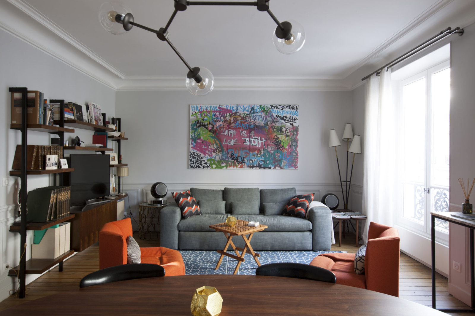 Masculin sans être austère. Sobre mais non sans fantaisie, ce salon est un joyeux mix de pièces contemporaines et d’objets chinés. Le tout veillé par l’impressionnante suspension Atomium AM.PM.
