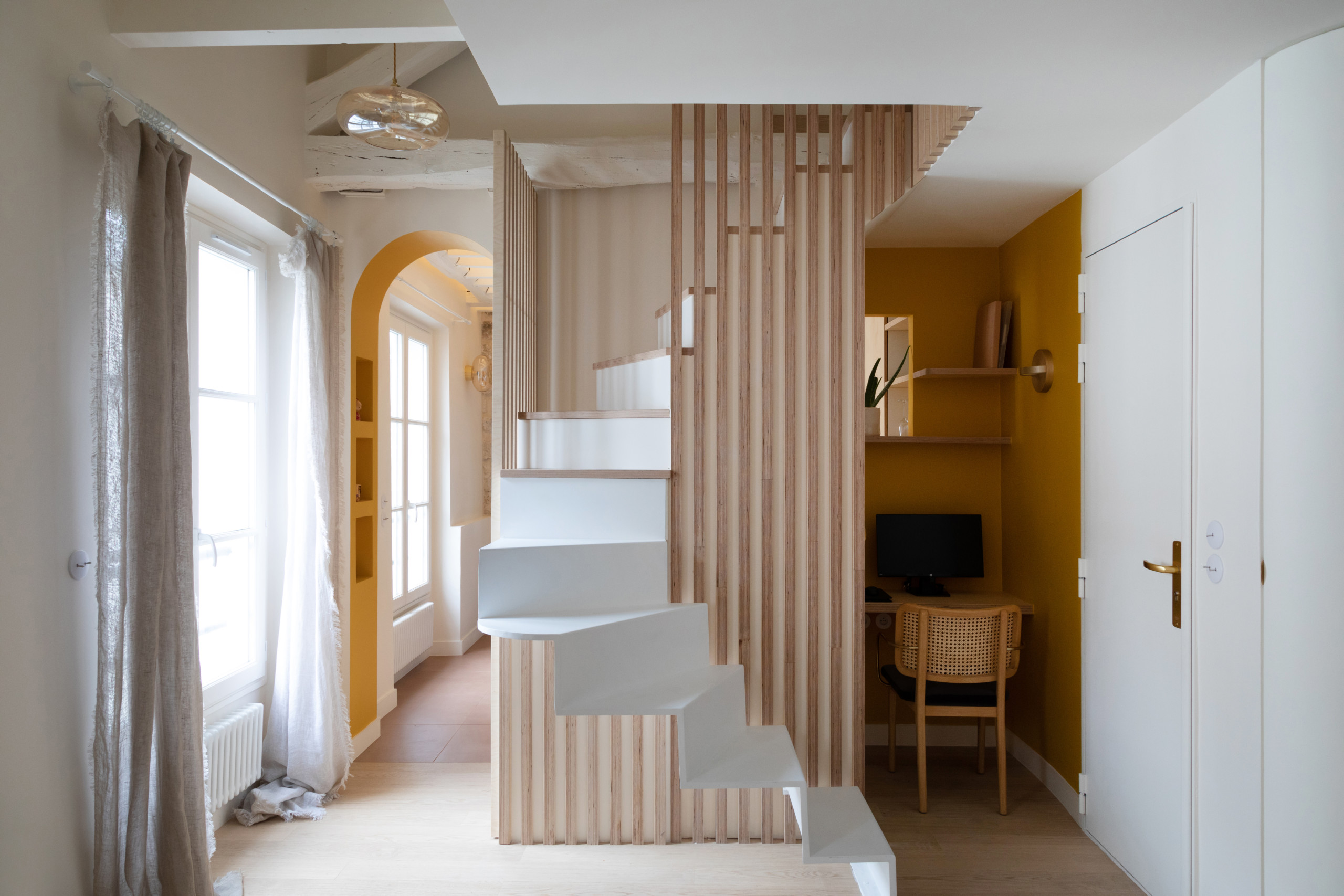 Nous entrons dans l’appartement. Une cascade de marches aériennes nous accueille. On est impressionné par la légèreté et l’aspect sculptural que dégage l’escalier. Très doux d’aspect, en bois de bouleau et contreplaqué blanc.