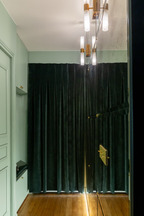 Derrière la porte d’entrée, un beau rideau en velours nous accueille dans cet écrin parisien. Un mur en miroir piqué effet vintage a été intégré afin d’éclaircir cette pièce sans lumière naturelle et de l’agrandir. L’effet est convaincant ! Intégrées au miroir, les appliques Avello de chez NV Gallery permettent bien sûr de se scruter sous toutes les coutures !