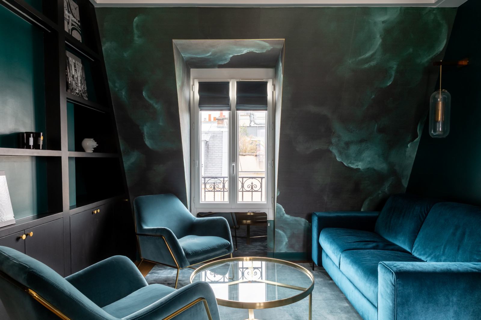 Après quelques travaux donc, les architectes ont réussi à matérialiser les envies du client et à créer cet écrin tout en élégance : ici, le noir se mêle à un camaïeu de verts et bleus profonds, saupoudré de touches de doré, marbre et velours pour apporter le soupçon de luxe en plus.