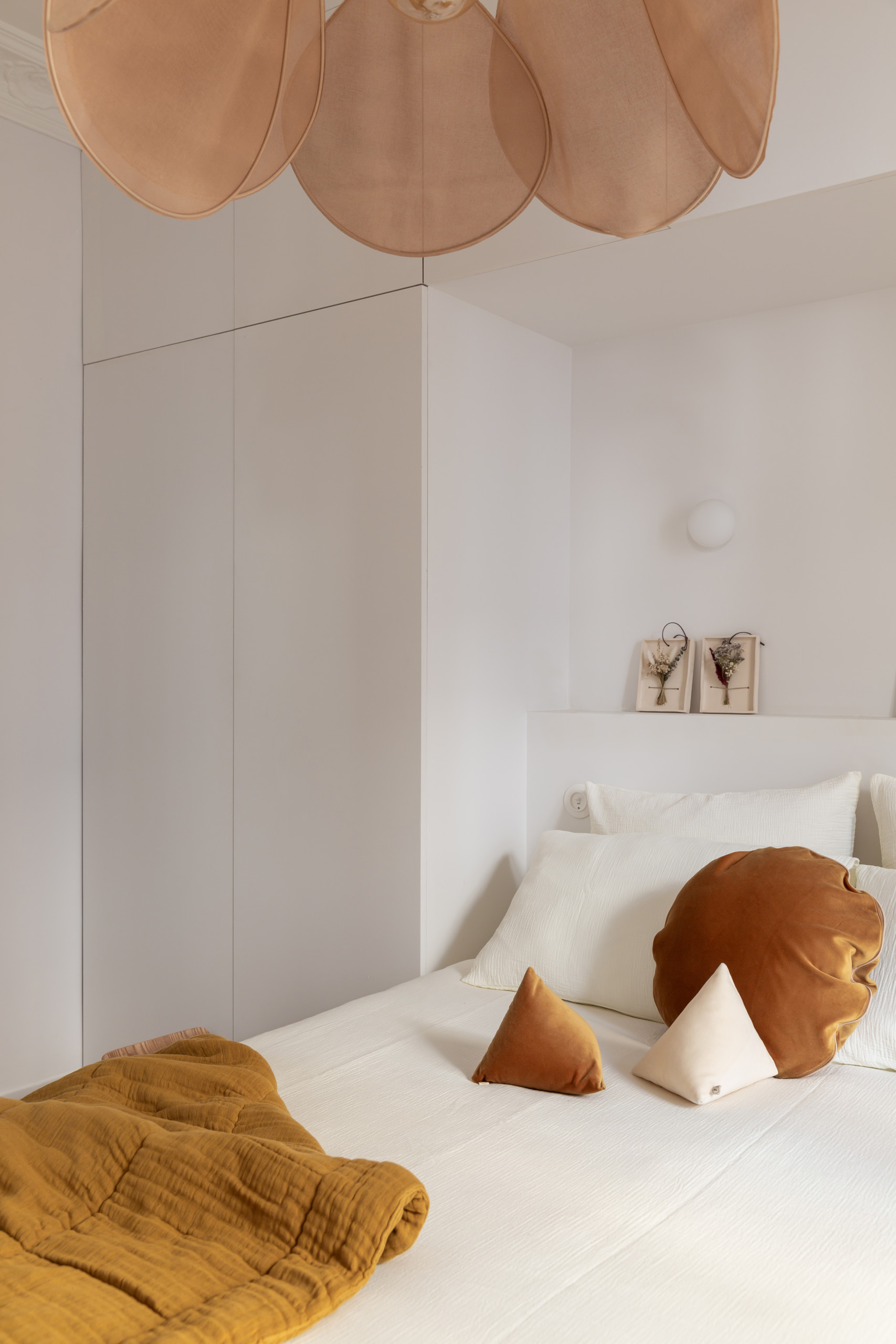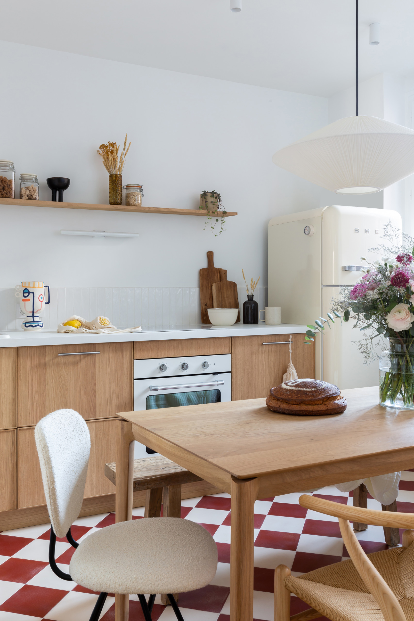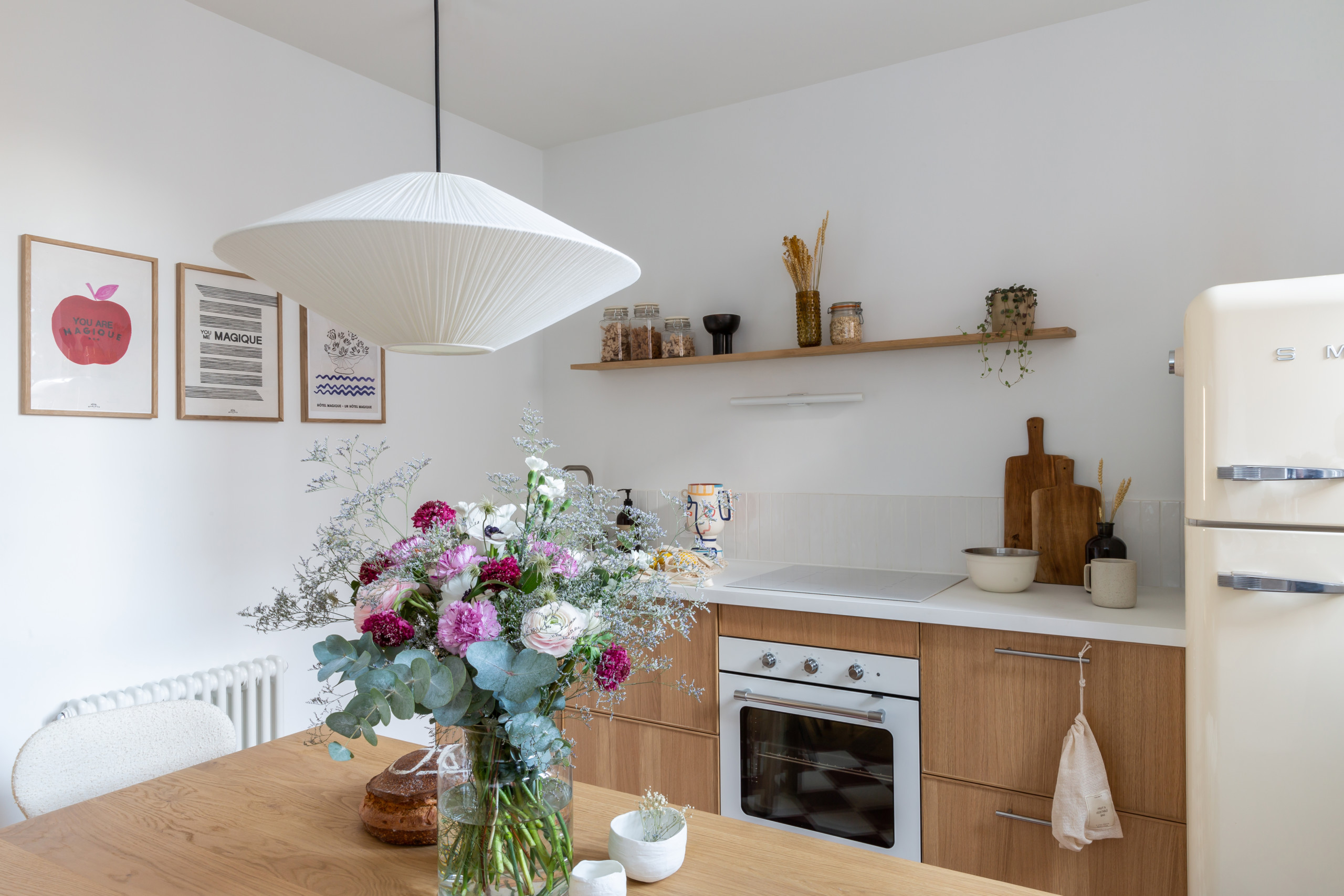 Diplômée de l'École Penninghen depuis quelques années, Inès Deschodt a toujours travaillé en agence. Des projets résidentiels, aux halls d’entreprises en passant par un restaurant, ses réalisations sont diverses et variées. Une chose est sûre, Inès sait s’adapter aux demandes de ses clients. Depuis peu, elle se tourne vers des projets qu’elle entreprend seule, lui permettant d’exprimer ses goûts et son talent sans aucune limite. Mais pouvait-elle satisfaire la plus exigeante des clientes ? Une personne experte en la matière, c’est-à-dire elle même ? Quoi de mieux pour aiguiser son art que de s’occuper de son propre logement !Lorsqu’on entre dans l’appartement, il suffit de faire quelques pas dans le couloir pour arriver dans la cuisine avec la grande table Bok de chez Ethnicraft et les chaises Wishbone de chez Carl Hansen.