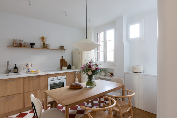 Diplômée de l'École Penninghen depuis quelques années, Inès Deschodt a toujours travaillé en agence. Des projets résidentiels, aux halls d’entreprises en passant par un restaurant, ses réalisations sont diverses et variées. Une chose est sûre, Inès sait s’adapter aux demandes de ses clients. Depuis peu, elle se tourne vers des projets qu’elle entreprend seule, lui permettant d’exprimer ses goûts et son talent sans aucune limite. Mais pouvait-elle satisfaire la plus exigeante des clientes ? Une personne experte en la matière, c’est-à-dire elle même ? Quoi de mieux pour aiguiser son art que de s’occuper de son propre logement !Lorsqu’on entre dans l’appartement, il suffit de faire quelques pas dans le couloir pour arriver dans la cuisine avec la grande table Bok de chez Ethnicraft et les chaises Wishbone de chez Carl Hansen.