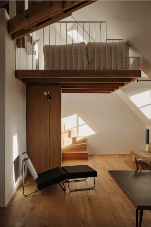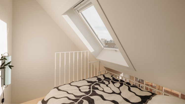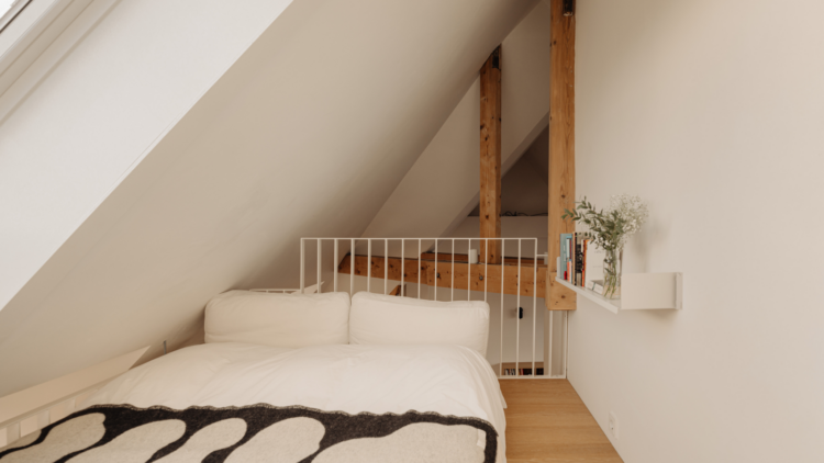 Plutôt qu’un plan cloisonné, il imagine une grande pièce traversante, structurée par l’îlot noir de la cuisine. « Ce n’est pas vraiment une histoire de matériaux, mais avant tout de couleur. Le noir crée une sorte de force gravitationnelle : on est naturellement attiré vers le plan de travail. » Autre geste fort : la chambre parentale, que l’architecte choisit de suspendre littéralement, accrochée d’un côté au seul mur porteur de l’appartement et de l’autre aux poutres du toit. « Je ne voulais pas de poteaux, ni couper le volume. Mieux valait une petite chambre bien pensée qu’un salon sacrifié ! »