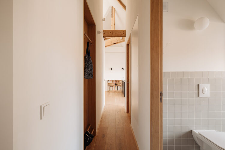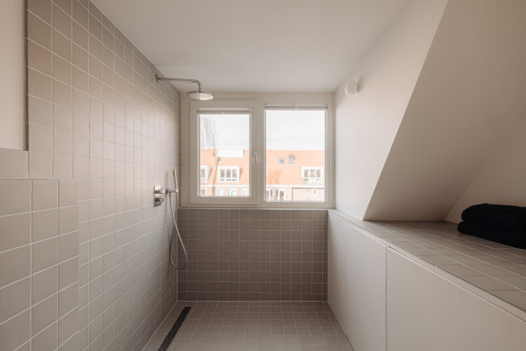 Côté décoration, le couple mise sur une palette courte mais exigeante : murs immaculés pour capter la lumière, poutres anciennes en sapin laissées brutes, menuiseries en chêne sur mesure (les volumes l’exigeaient !). Dans la salle de bains, des carreaux anciens de style Winckelmans (fabriqués dans la même manufacture française), chinés dans le nord du Pays-Bas, dévoilent leur patine. Ici rien d’ostentatoire, mais un sens aigu du confort moderne : isolation renforcée, ventilation discrète, inertie thermique naturelle et qualité d’air maîtrisée.