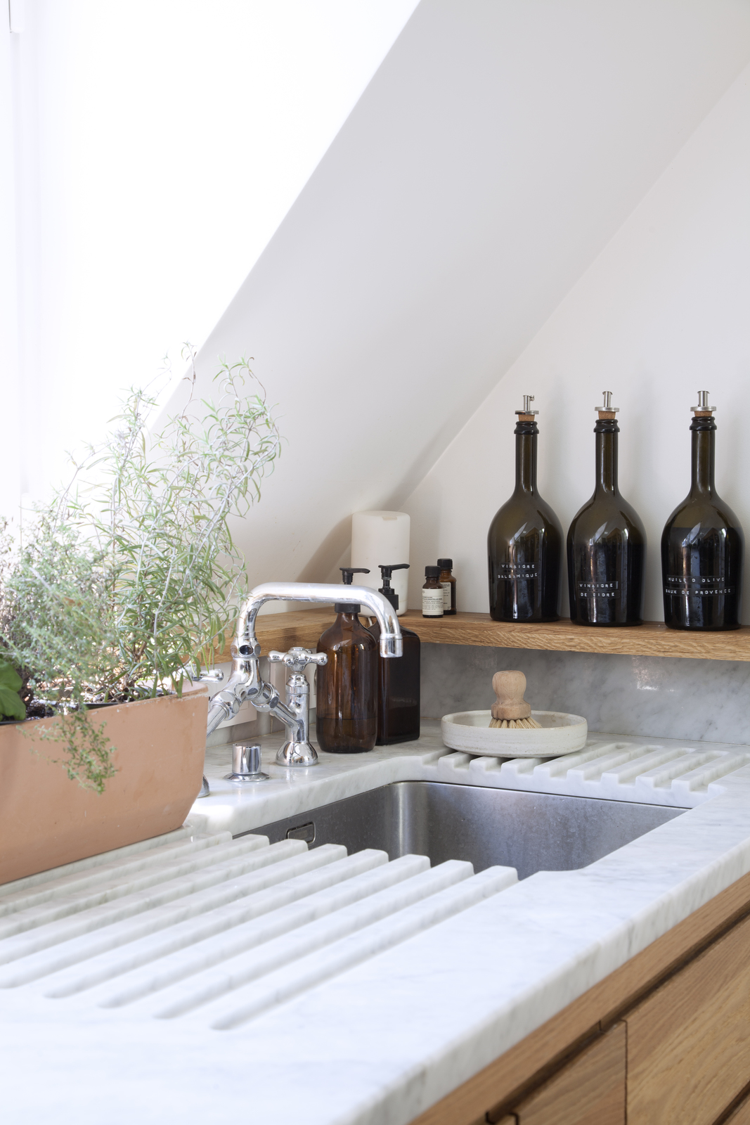 La jeune architecte Louise Bech a commencé par faire ses gammes dans de grosses agences où elle enchaîne les projets souvent impersonnels, rarement passionnants mais évidemment très formateurs. Une bonne méthode pour se faire la main mais qui atteint rapidement ses limites pour une professionnelle au goût sûr et au talent certain. Elle décide donc de se lancer, seule, et crée son cabinet, Source Architecture. Un de ses premiers projets va lui permettre de faire la démonstration de l'étendue de son savoir-faire : il s'agit de transformer plusieurs chambres de service contigües en un seul et même espace et de le relier à une pièce supplémentaire située à l'étage du dessous. Les travaux sont donc importants et complexes. Pour couronner le tout, ils révèlent au fur et à mesure de leur avancée les nombreuses faiblesses structurelles du vieil immeuble du XIXème siècle qu'il a fallu renforcer. On dit que les cordonniers sont les plus mal chaussés. A croire que les architectes font mentir l'adage quand on voit le résultat puisque ce projet est aussi l'appartement de Louise.