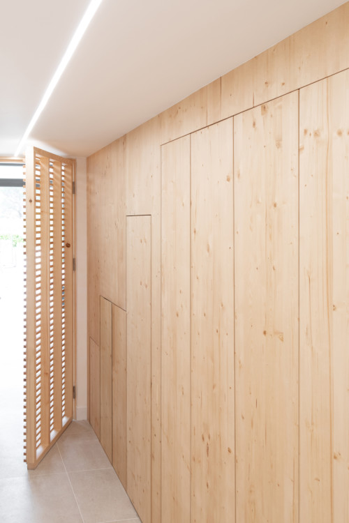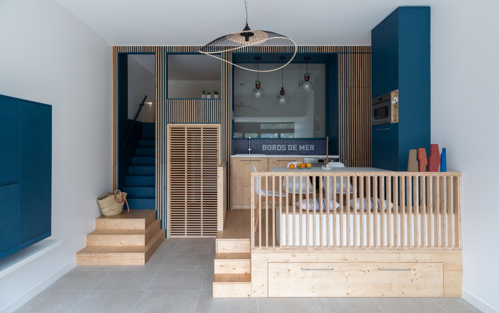 Dès l’entrée, le ton est donné. La présence du bois nous plonge immédiatement dans l’esprit cabane et pinède. Derrière ses grandes portes se cachent des placards sur-mesure.
