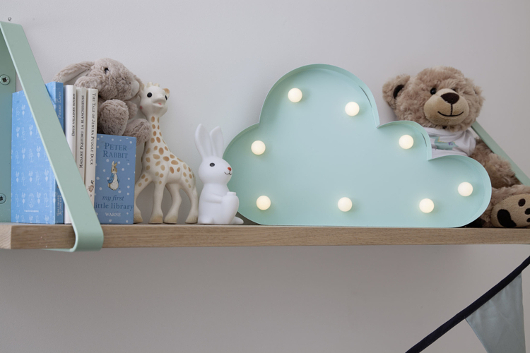 Même code couleur que dans la pièce de réception pour Mister Rabbit et ses amis qui peuplent le coin kidfriendly de l’appartement. Lampe nuage Primark.