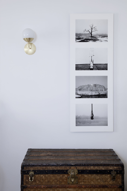 Des photos (Galerie Maubert), une malle de voyage (heureux héritage familial), Anne-Sophie s’est créée sa mini fondation LVMH ! Très chic avec l’applique en métal doré de Cedar & Moss.