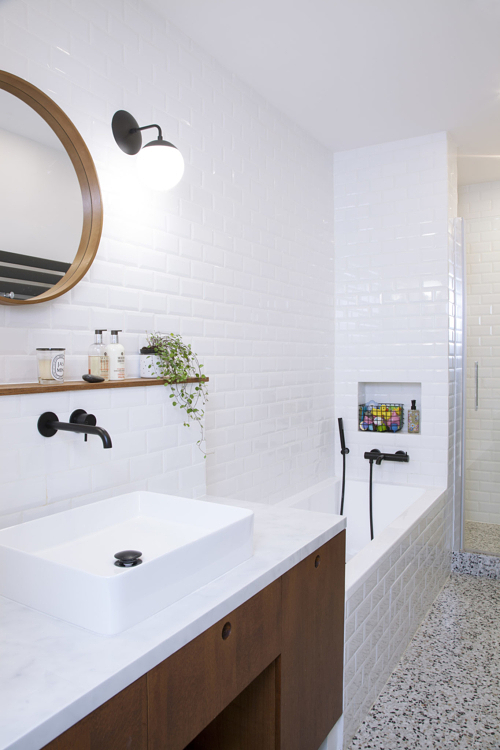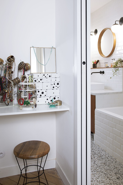 À chacun sa Madeleine de Proust ! Anne-Sophie voulait absolument retrouver le terrazzo de son enfance. Il fut donc posé au sol tandis qu’on habillait les murs de l’ancien couloir transformé en salle de bain avec la très parisienne faïence du métropolitain. Puis, les détails ont parfait la scénographie : robinetterie noire Cristina Ondyna, miroir de chez La Redoute Intérieurs et toujours le coup de cœur d’Anne-Sophie, les appliques Cedar & Moss.