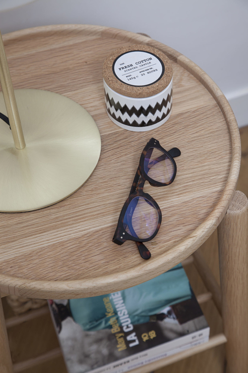 Mais que peut donc bien lire une fondue de cuisine ? Allez, on met ses lunettes et on on jette un œil sous la table de chevet Ercol…
