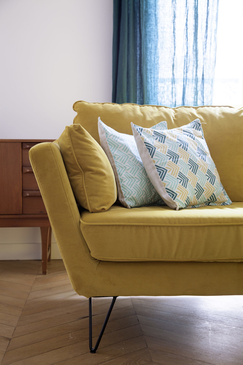 Le canapé Topim de La Redoute avec son velours mimosa fait régner toute l’année en ce lieu, un joyeux air de vacances d’été. Tandis que le bleu paon des rideaux en lin de chez La Redoute Intérieurs et ceux des coussins de la marque Mademoiselle Dimanche rappellent les ondes de la Méditerranée. En arrière-plan, une enfilade chinée à Londres sur le Leboncoin anglais, Gumtree.