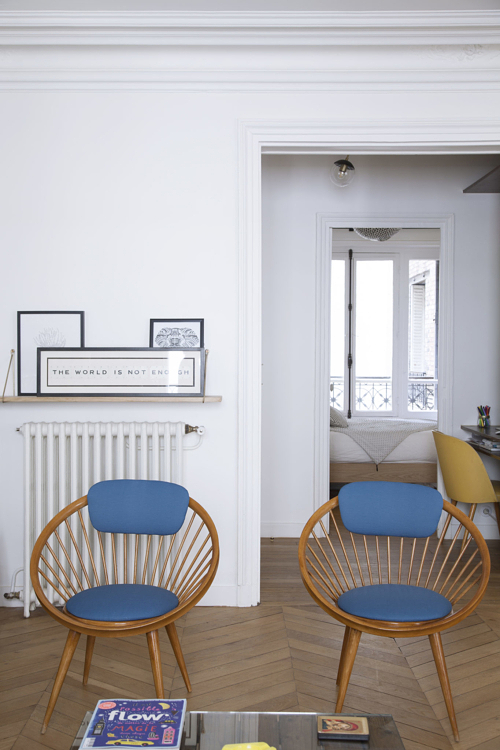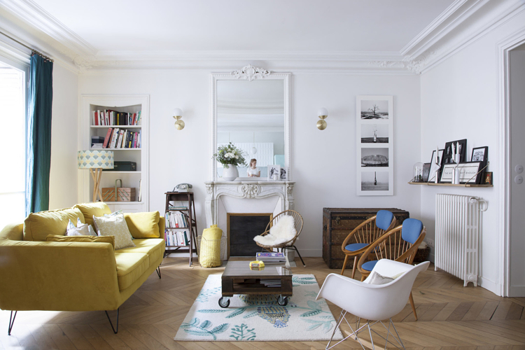 Trois petites pièces exigües ont laissé place au généreux séjour acidulé. Le parquet en point de Hongrie, les moulures, la cheminée Louis XV en marbre et le trumeau d’origine lui confèrent toute sa noblesse tandis que s’y intègrent sans heurts quelques éléments de mobilier contemporain. (tapis Anthropologie).