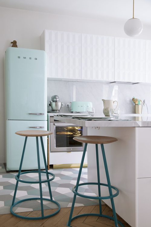 Le tapis carrelé (Mosaic Del Sur) qui fait écho aux façades en diamant, modèle HERRESTAD de chez Ikea, délimite la cuisine mentholée du salon-salle à manger. On remarque le plan de travail immaculé de chez Néolith qui fait aussi bar. Tandis qu’on y dissimule de nombreuses prises très pratiques, on s’installe de part et d’autre sur des tabourets Gustave par Hartô Design pour déguster une des réalisation de la maîtresse de maison ! Notez la plinthe en laiton de la marque Superfront qui signe tout le chic discret de l’endroit.