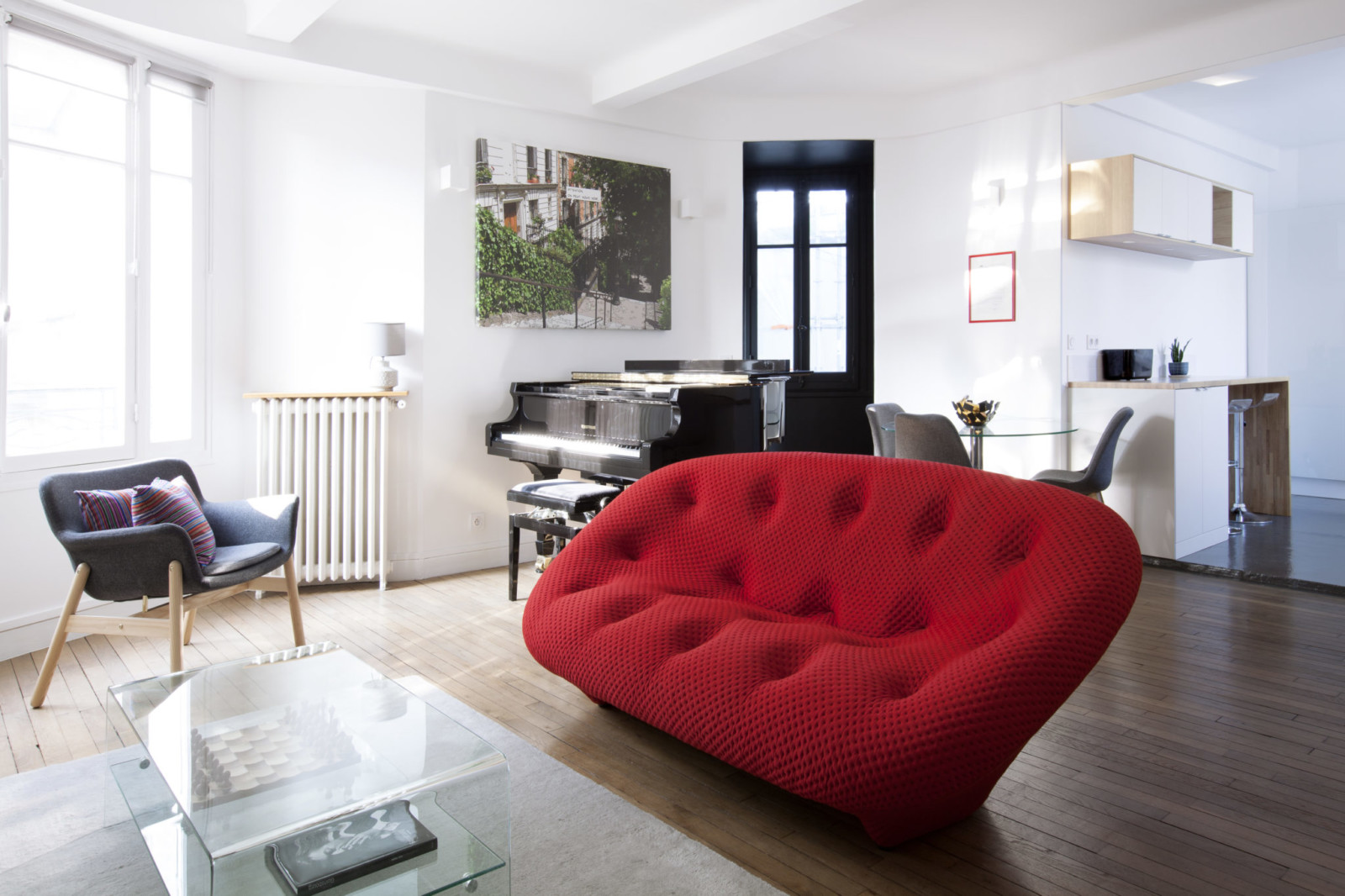 L'appartement de 62 m² que nous allons découvrir est le second qu'il visite pendant sa recherche. Rue calme dans un quartier vivant, dernier étage d'un immeuble des années 30, grande pièce à vivre, lumineux. Tous ces éléments sont très appréciables mais, vous l'avez compris, le plus important se situe ailleurs. Comme dans la largeur du couloir d'entrée de l'appartement, les dimensions de la cage d'escalier ou la taille du hall de l'immeuble. Des critères qui permettent au piano de monter au sixième étage, passer la porte et s'installer confortablement dans le séjour. Ouf !