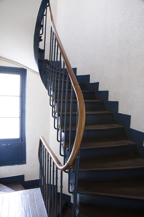 Le hasard fait souvent si bien les choses. L’escalier comme une invitation à découvrir l’appartement de Cécile. La teinte bleue nuit de ses contres-marches et le noir de sa rambarde en fer forgé annoncent déjà la(les) couleur(s).