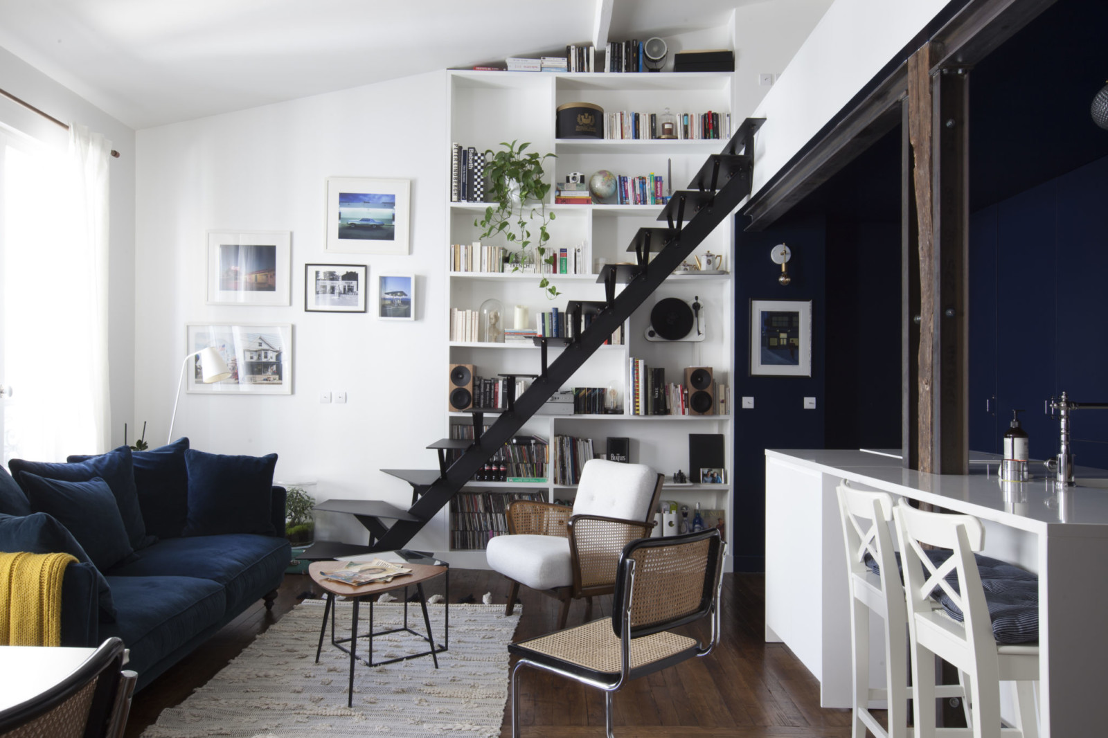 C'est au sixième étage d'un immeuble haussmannien du quartier de la Goutte d'Or à Paris que Cécilia et Benjamin ont déniché la perle rare qu'ils cherchaient depuis longtemps. La situation initiale est un classique du genre : 60 m² ultra cloisonnés, bas de plafond avec un sol en pente... mais l'espace présente de sérieux atouts : un étage élevé, des combles accessibles et de grandes fenêtres sans vis-à-vis.