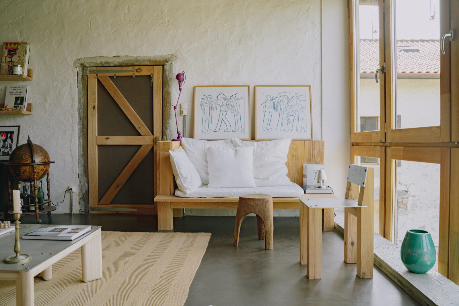« Les poutres du plancher sont en chêne. Elles ont au moins deux cents ans et font quasiment la taille des arbres. On n’en fait plus de cette qualité », commente l’architecte, qui prend plaisir à conserver les aspérités des pierres et du bois. En un an, le rez-de-chaussée est transformé en atelier de charpentier-menuisier, et le premier étage en habitation. Pour garnir ce cocon de bois, Maud et Maxime choisissent patiemment chaque matériau, chaque meuble, chaque décoration. En esthète, Maud chine des pépites dans les brocantes du coin, et Maxime fabrique lui-même ce lit, cette banquette, ces fauteuils, ce bureau et cette grande table en pin maritime qui donnent tant d’épure et de solidité au studio, entre tradition et modernité. « J’ai adoré le fait d’arriver sans idées préconçues et sans être pressée par le temps », raconte Maud. Tout a été rajouté au fur et à mesure et ça se ressent : chaque objet a un peu sa place, ici.