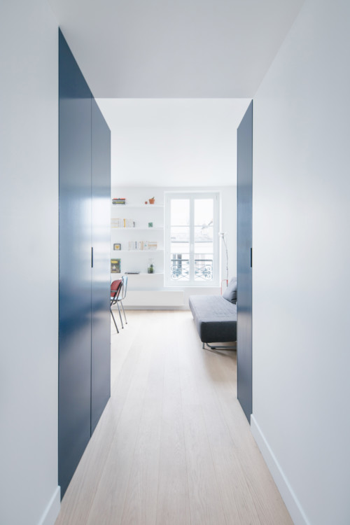 Pour rénover cet appartement de 28 m² en plein cœur de Belleville, le duo d’architectes Sébastien Gnaedig et Agathe Marimbert ont eu une vision singulière : créer trois volumes, sortes de boites dans la boite, afin de structurer l’espace. L’inspiration leur est venue d’Outre-Atlantique. Plus précisément, de l’artiste Donald Judd qui s’est fait connaître pour son travail autour de volumes géométriques en trois dimensions. Pour ce projet parisien, ils ont alors repris l’idée de ces formes pour gérer les transitions entre l'espace d'entrée, le salon/salle à manger et l'espace nuit. Et créer, par la même occasion, des rangements cachés, le tout, « dans un esprit très minimaliste », note Sébastien Gnaedig du bureau d’architecture Naed.