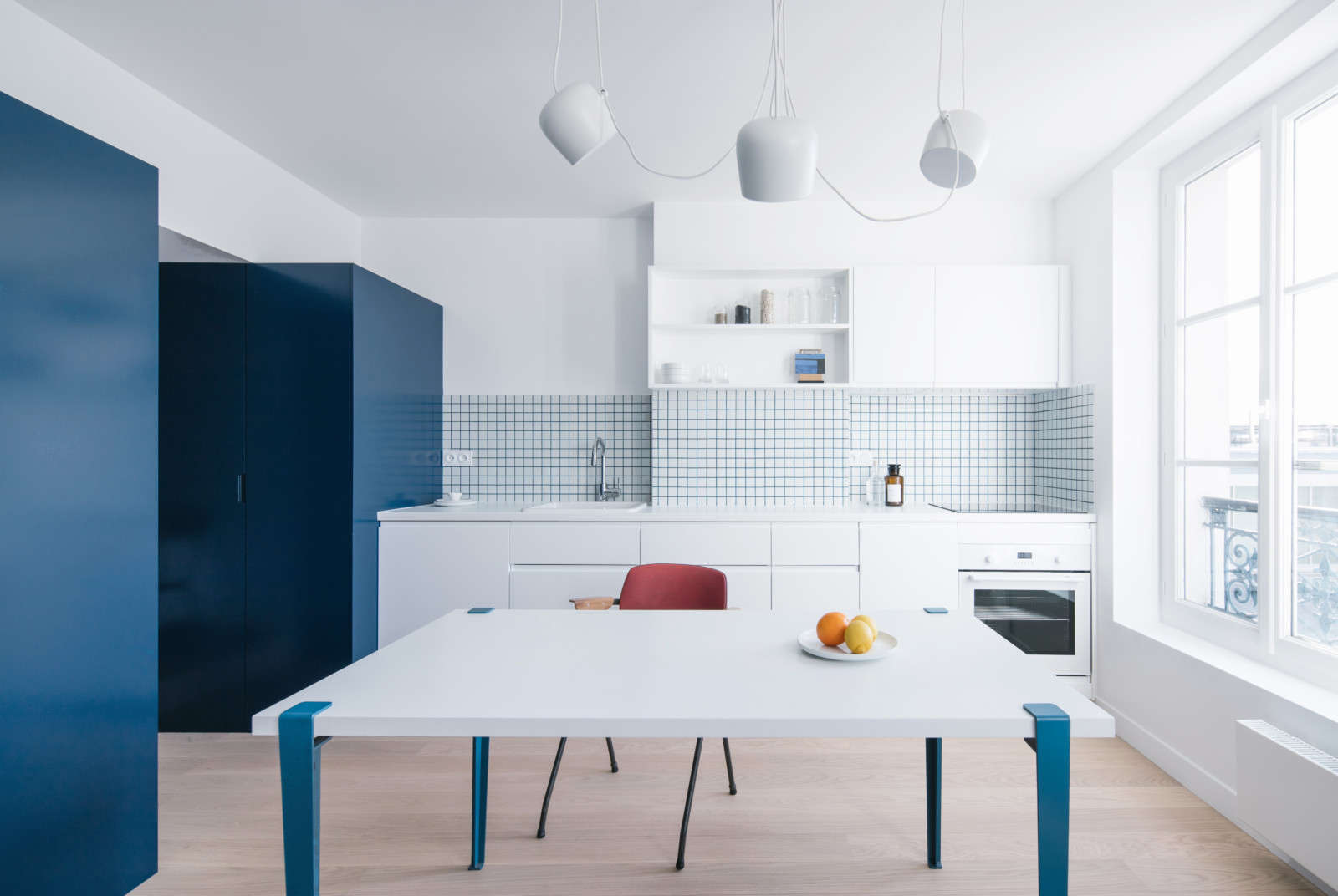 Pour mettre en valeur ces volumes, les architectes ont joué la carte du contraste en optant pour une couleur bleu nuit, le Royal Navy de Little Greene, particulièrement appréciée par le client. Comme un fil conducteur, elle se décline dans chaque espace de l’appartement, de l’entrée jusqu’à la cuisine, en passant par la salle de bain. Le résultat : une visite 100 % graphique et chromatique.
