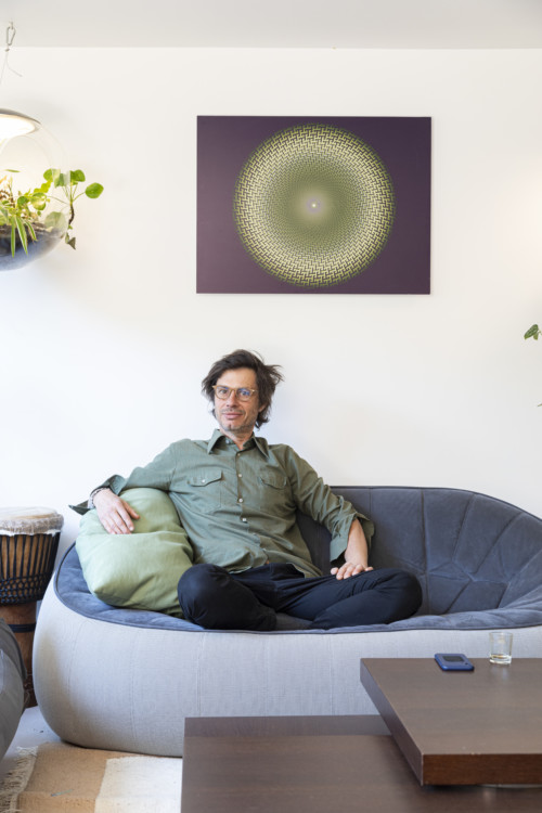 À l’intérieur du loft, deux maîtres mots : optimisation de l’espace et équilibre des quatre éléments. Également architecte, il pense le lieu comme s’il était dans un bateau, réorganise la disposition des pièces pour économiser un couloir, élimine les obstacles visuels, travaille la fluidité. Le designer a un souhait : avoir le sentiment de vivre en harmonie avec la nature. Des touches de nature que l’on retrouve partout, de la photo de la jungle qui camoufle les parois des placards et du réfrigérateur, aux poignées en bois le long de l’escalier “
