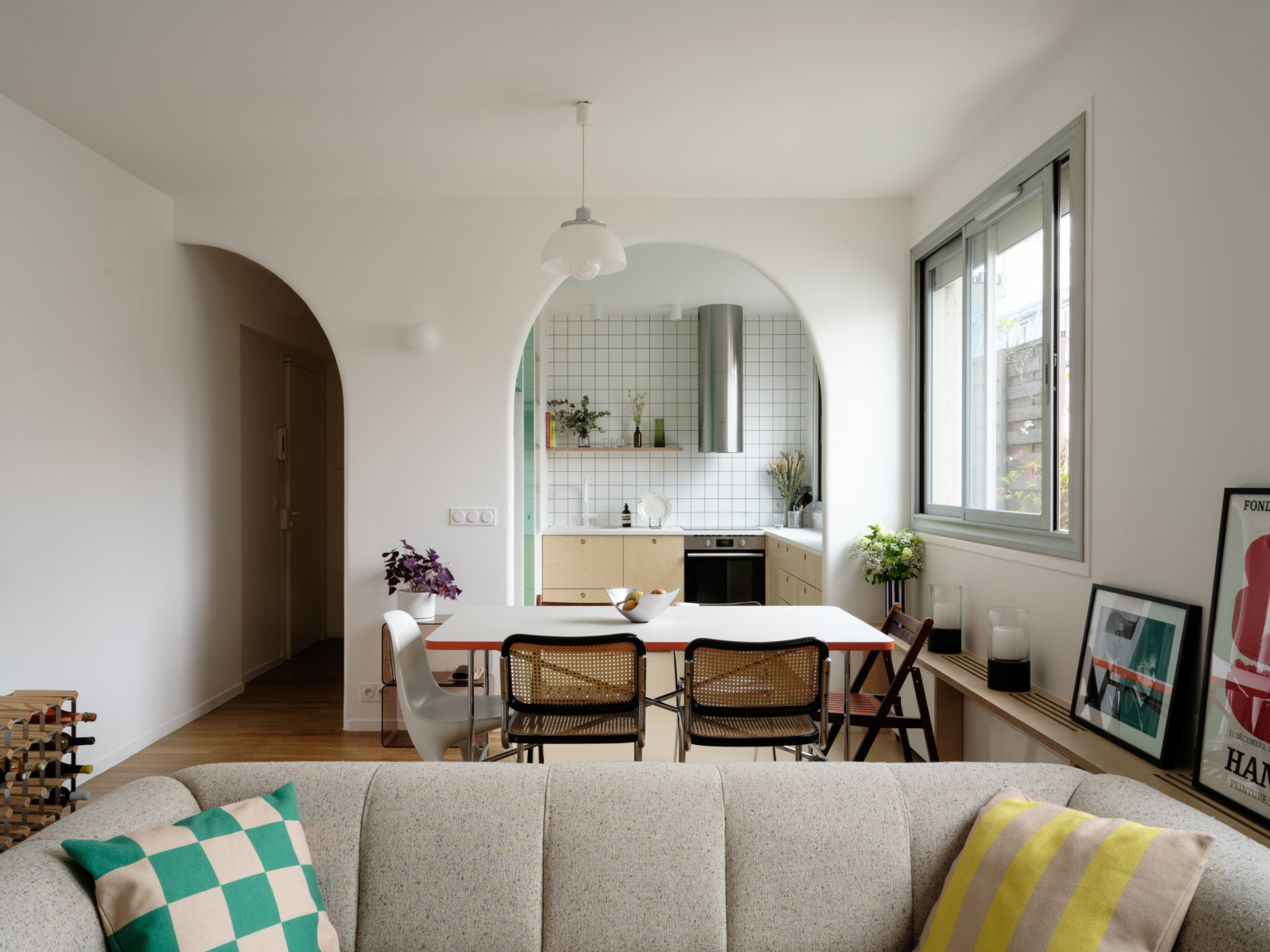 Simon apprécie les formes circulaires ; ce sera le point de départ de ce projet pensé par Agathe et son équipe : « l’idée n’était pas de se retrouver avec une sorte de pastiche méditerranéen dans un immeuble qui n’a rien à voir avec cette esthétique, mais de s’inspirer de formes géométriques assez simples », faisant écho à l’appartement et notamment à ses baies vitrées rectangulaires. Naîtront de ces réflexions le point phare de la rénovation : trois arches créées pour démarquer respectivement l’entrée, la cuisine et la salle d’eau, sans pour autant cloisonner ces fonctions. Cette ouverture des espaces était indispensable aux yeux de Simon : « Je donne est et ouest, donc la lumière peut traverser l’appartement, ce qui n’était pas vraiment visible auparavant. Le couloir menant à la chambre était très fermé. Maintenant tout est ouvert et hyper lumineux ».
