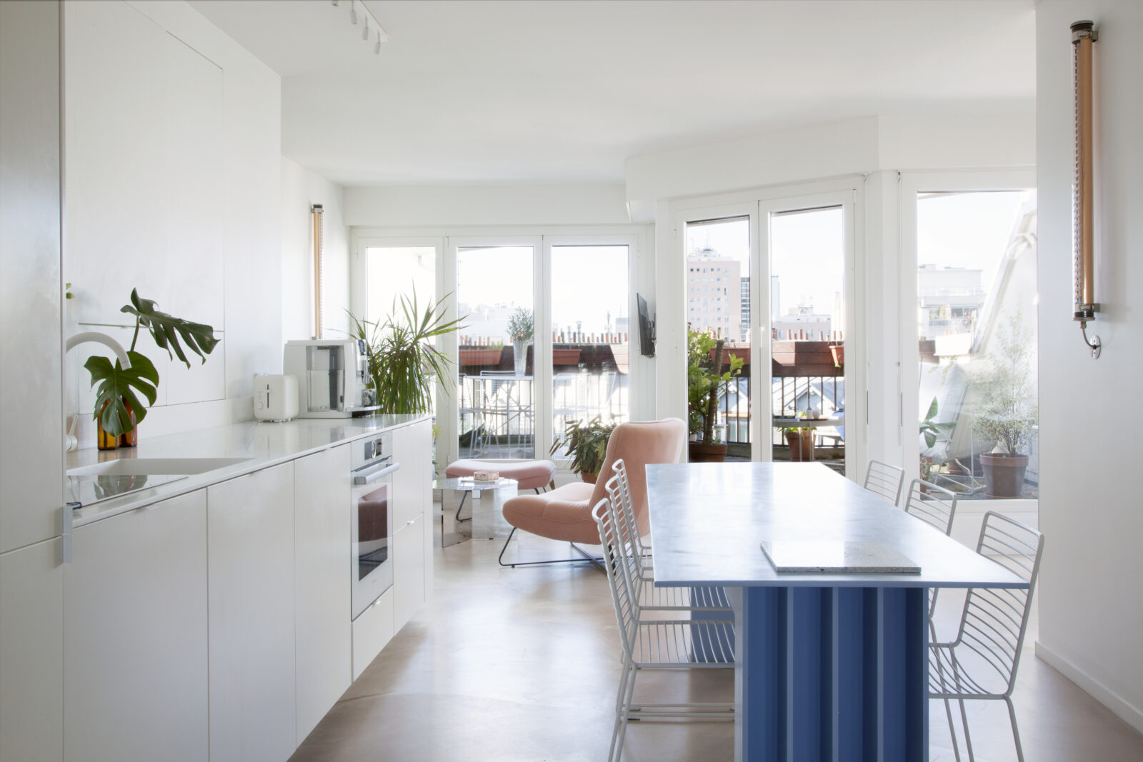 Elles ont pensé ensemble le projet. « L’appartement étant traversant, on a décidé de jouer au maximum le côté tout en longueur, étroit. On ne l’a pas cassé, bien au contraire », explique Nastasia. L’espace est ainsi structuré par des lignes, qui amènent vers la vue. « L’idée était de compacter la partie nuit côté cour pour dégager un maximum d’espace pour le séjour, en contact avec la terrasse, et accentuer la continuité entre le dehors et le dedans. » S’engage alors un jeu de reflets, de matières et de couleurs afin de « faire rentrer » le paysage à l’intérieur. « On a essayé d’intégrer par touches de couleurs ce que l’on pouvait voir depuis la terrasse. » Du rose pour la façade d’un immeuble voisin des années 80, du bleu pour le ciel, du gris et du métal pour les toits en zinc… « C’est comme si on avait pris la palette de ce que l’on voyait dehors et qu’on l’avait injectée à l’intérieur ! » Un astucieux jeu d’échos.