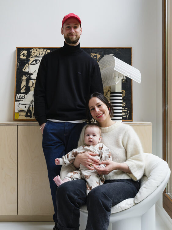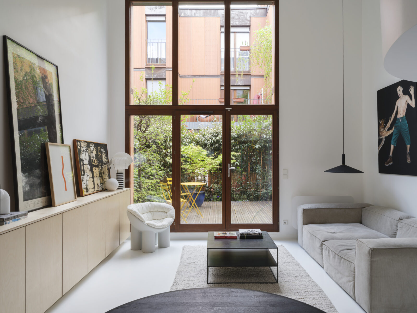 Face à deux tableaux accrochés derrière le canapé couleur sable du salon, Carla se fige, songeuse. « Ce sont des réinterprétations de scènes mythologiques signées Nicolas Maureau, un artiste toulousain que j’adore... » Cette avocate de 32 ans nourrit une passion certaine pour l’art, tout comme son compagnon Matthieu, 34 ans, ingénieur informaticien. Originaires des Hautes-Pyrénées, ils se sont rencontrés au lycée avant de rallier la capitale, voilà quatorze ans. Les Sudistes passeront par les 6e, 14e, 8e et 18e arrondissements, avant de jeter leur dévolu, en 2018, sur cette maison mitoyenne à trois niveaux, nichée au creux d’un ensemble immobilier verdoyant nommé Villa Chevalier, réalisé par tectōne architectes urbanistes (Pascal Chombart de Lauwe et Sabri Bendimérad), à La Plaine Saint-Denis.