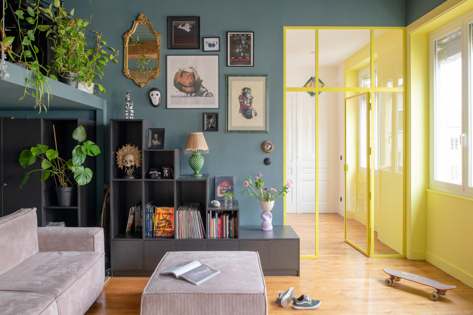 La pièce à vivre, centrale, est mise en valeur par la teinte uniforme et intense des murs et du plafond (Inchyra blue de Farrow&Ball). Son parquet d'origine, récupéré sous le parquet flottant posé par l’ancien propriétaire, est remis à neuf. Cet espace se tourne encore plus vers l’extérieur avec l'installation d'une grande verrière dans un pan de mur, permettant de profiter de la luminosité d'une fenêtre supplémentaire qui se répand également dans la cuisine ouverte grâce à un subtil jeu de miroirs. Une vraie place est donnée à cette cuisine qui s’impose en pièce maîtresse dans le reste de l'espace et propose des matériaux et volumes contrastants. Les « pièces secondaires » sont revalorisées : un atelier ouvert sur le reste de l’appartement et bénéficiant d’une belle luminosité est créé, ainsi qu’une chambre écrin, aux couleurs et revêtements molletonnés, éclairée en second jour. "À son emplacement se trouvait une pièce acoustique dont il a fallu entièrement déposer les multiples épaisseurs d’isolant au mur et au sol, se souvient Célia. Le papier peint découvert en dessous a été conservé et encadré pour servir de niche."